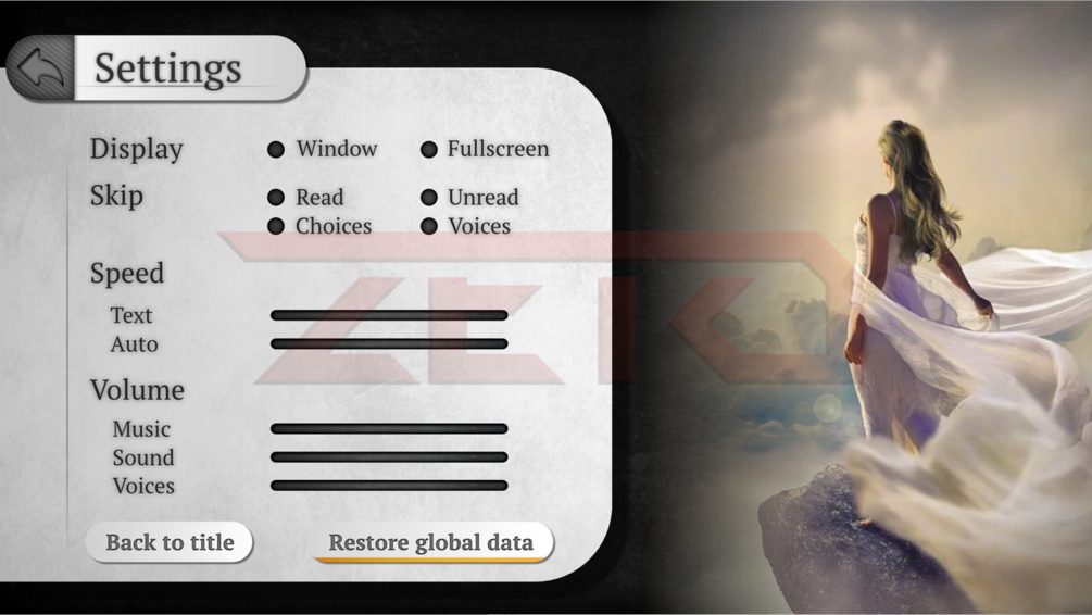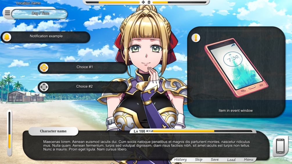 High-resolution 1920x1080 PSD raster and vector AFDESIGN (Affinity Designer) assets for a visual novel, including comprehensive menus and game interface elements.